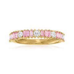 Ross-Simons presents contemporary styles with a timeless appeal. 0.50 ct. t.w. baguette pink sapphires and .36 ct. t.w. round brilliant-cut diamonds line this sweet ring. Set in polished 14kt yellow gold. 1/8" wide. Diamond and pink sapphire ring. Each Ross-Simons item arrives in a fine jewelry presentation box. Shop Ross-Simons jewelry risk-free as all items include a 30-day, 100% money-back guarantee.Stone InformationGem Type 1 - SapphireStone Cut 1 - Good-CutStone Color 1 - PinkStone Clarity 1 - PinkStone Shape 1 - Rectangular-ShapeStone Creation Method 1 - NaturalStone Treatment Method 1 - HeatedStone Weight 1 - 0.50 CaratsNumber Of Stones 1 - 14Gem Type 2 - DiamondStone Cut 2 - Good-CutStone Color 2 - I-JStone Clarity 2 - I2Stone Shape 2 - Round-ShapeStone Creation Method 2 - NaturalStone Treatment Method 2 - Not-TreatedStone Weight 2 - 0.36 CaratsNumber Of Stones 2 - 5