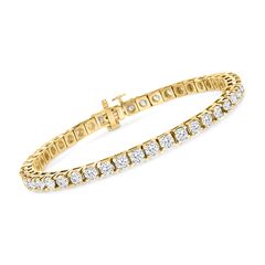 A trusted jeweler in 1952, Ross-Simons is dedicated to quality and value. This tennis bracelet is alight with the magnificent shimmer of 5.00 ct. t.w. round brilliant-cut diamonds set in a sumptuous row of 14kt yellow gold. Single latch safety. Push button clasp, diamond tennis bracelet. Each Ross-Simons item arrives in a fine jewelry presentation box. Shop Ross-Simons jewelry risk-free as all items include a 30-day, 100% money-back guarantee.Stone InformationGem Type 1 - DiamondStone Cut 1 - Good-CutStone Color 1 - H-IStone Clarity 1 - I2Stone Shape 1 - Round-ShapeStone Creation Method 1 - NaturalStone Treatment Method 1 - Not-TreatedStone Weight 1 - 5.00-5.50 CaratsNumber Of Stones 1 - 52-60