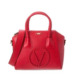 Introducing the 'Valentino by Mario Valentino Minimi Rock Leather Satchel' in Flame Red. With its elegant design and luxurious Italian craftsmanship, this satchel is a must-have for any fashion-forward woman. The exterior features signature logo detailing, while the interior is lined with fabric and equipped with multiple pockets for organization. Measuring 11 inches wide by 9.5 inches high and 6.5 inches deep, this satchel offers ample space for all your essentials. Carry it by the top handles with a 7-inch drop, or use the adjustable and removable shoulder strap with a 31-inch drop for added convenience. Complete with a zippered top and protective feet at the bottom, this satchel is both stylish and practical. Made in Italy, this handbag is a timeless investment piece that will elevate any outfit. Please note that all measurements are approximate and slight variations may occur. Elevate your accessory game with the Valentino by Mario Valentino Minimi Rock Leather Satchel.
