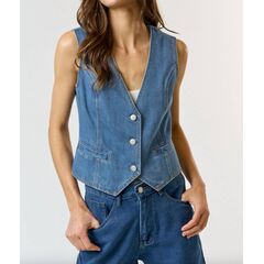 That extra layering piece you didn't know you needed!This denim button-down vest top is made of 85% cotton and 15% polyester. It features a V neckline, sleeveless design, and a cropped fit.