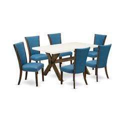 Introducing East West furniture's innovative furniture set that can turn your house into a home. This exclusive and elegant dining set contains a kitchen table combined with Parsons Dining Chairs. Impressive wood texture with Distressed Jacobean and Linen White color and a cross leg design specify the strength and durability of the dining table. The optimal dimensions of this kitchen table set made it quite simple to carry, clean, assemble and modify its places. The base is manufactured from sturdy hardwood Acacia, the kitchen table can be assembled without any extra tools and made to last for a long.Bring these comfy parson chairs in your dining room which add a timeless elegance to your dining room and are easy to incorporate into just about any existing style – or future decorating plan! Tall back, upholstery, high-density foam padding, solid hardwood frame construction, and linen upholstery make these parson chairs comfortable, durable and attractive. The curved design of the chair with Blue color fabric and Distressed Jacobean finish frame has made the chair modern and elegant. Whether you use this dinette chair in your dining room, kitchen, living room or basement, it is an easy to assemble and stylish answer to your seating needs.Table Specifications - Table Base Material - Acacia Wood Color - Distressed Jacobean and Linen White Dimensions - Length 60; Width 36; Height 30Chair Specifications - Fabric - Linen FabricFrame Material - Solid WoodCushion Material - Foam Fabric Color - BlueFrame Color - Distressed JacobeanDimensions - Width 20; Depth 18; Height 42.Includes - 1 x Rectangular Table6 x Parson Chairs