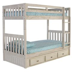 This twin over twin size bunk bed in a light ash finish provides plenty of sleeping area and storage while taking up very little space. This unit is constructed of solid wood and is ready to assemble. The three-drawer under bed unit provides ample space for storage. Mission styling with metal drawer guides and attractive pulls.