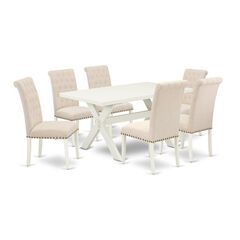 EaST WEST FURNITURE 7-PIECE KITCHEN DINING TaBLE SET 6 WONDERFUL PaRSON DINING CHaIRS and RECTaNGULaR WOOD DINING TaBLEOur dining room table set includes 6 amazing Padded Parson Chairs and a wonderful X-leg wood table. The modern dinette set provides a Mahogany solid wood modern dining table and body and a wonderful Dark Khaki Dining Chairs seat and high back that bring elegance to your living area and improve the charm of your fantastic dining room. The premium quality of our beautiful chairs helps our wonderful customers to get relaxation and feel free when getting their meal. This butterfly leaf table built from superior quality rubber wood which can bear the weight of 300 Lbs. Our parson dining chairs have a wooden structure with a luxury seat of high-quality foam which is covered with Linen Fabric that delivers you relax with family or friends. This listing has a premium color of Mahogany finish for wood table and Dark khaki finish of parson dining chairs. Our gorgeous premium colors boost the beauty of your dining-room and give a high-class look to your dining room or dining area. East West Furniture usually constructed from modern furniture along with easy assembling parts. We try to keep our furniture parts innovative as well as simple. Our high-class dining room set is ideal for your attractive living area as well as the kitchen. You can use it for casual home parties. Keep enjoying East West modern furniture!Features - Fabric Material - Linen FabricFabric Color - Ligh BeigeMeasurements of lovely dinner table - L 60 x W 36 x H 30. The dimensions of amazing parson dining chairs are - L 26 x W 19 x H 42Package Include - 6 Lovely upholstered dining chairs and a Lovely dining table.