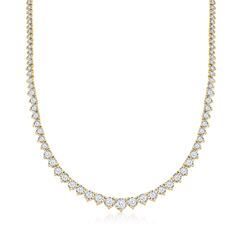 Ross-Simons travels the world to find beautiful, high-quality styles at the best prices. It's the timeless tennis necklace with no shortage of sparkle! Polished 18kt yellow gold over sterling silver settings boast 5.00 ct. t.w. round brilliant-cut diamonds that grace the neckline with glimmer and gleam. Make this classic part of your collection in all its sparkling glory. White rhodium where diamonds are set. Graduates from 1/16" to 1/4" wide. Figure 8 safety. Push-button clasp, diamond tennis necklace. Each Ross-Simons item arrives in a fine jewelry presentation box. Shop Ross-Simons jewelry risk-free as all items include a 30-day, 100% money-back guarantee.Stone InformationGem Type 1 - DiamondStone Cut 1 - Good-CutStone Color 1 - I-JStone Clarity 1 - I3Stone Shape 1 - Round-ShapeStone Creation Method 1 - NaturalStone Treatment Method 1 - Not-TreatedStone Weight 1 - 5.00 CaratsNumber Of Stones 1 - 175