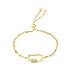 Turn heads with this sparkling and unique piece! The center carabiner charm is adorned with gleaming CZ stones, and the sliding bolo allows you to choose the perfect fit. Available in gold and silver tones. _x000D_ Materials - 14K gold or rhodium plated brass, cubic zirconia_x000D_ Features -  Adjustable up to 8", 0.75" carabiner, Lead & Nickel free, bolo/sliding knot- one size fits most