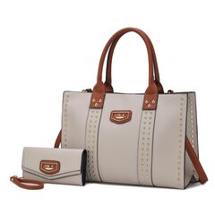 Designed in a soft structured silhouette, our Davina Tote Bag is the ultimate finishing touch to create a polished look. Rendered in high-quality pebbled vegan leather, with a color-blocked finish, and designed with gold-tone embellishments, this tote will become your favorite everyday accessory. Unzips it to reveal a fully lined interior with slip pockets and a wall zippered pocket. Top handles are smooth and comfortable for holding or attach the adjustable strap to wear it crossbody when the mood strikes. The Davina Tote Bag has a flat base for stability. It comes with a matching wallet.POCKETS - Interior features a wall zip pocket, two slip pockets.Measurements - 14.5” W x 11.5” H x 6” DHandle Drop - 6.7”Adjustable and Removable strap - 14”-26”Wallet - 7.5” w x 4” H x 1” D1 center zip pocket, 8 card slots, 2 slip pocket, snap button