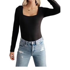 Who doesn't love a good bodysuit?Stretchy Knit. Square Neckline. Lined Front. Snap Crotch Closure . Fitted Silhouette. True to Size. 90% Polyester, 10% Spandex.