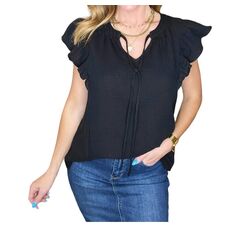 A versatile blouse that works from desk to dinner!Breathable. Crinkle Cotton. Functional Front Keyhole Tie. Ruffle Sleeve. Side Panel Detail. Oversized Fit. Preshrunk. True to Size. 100% Cotton.