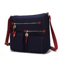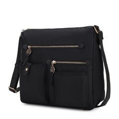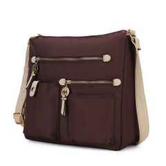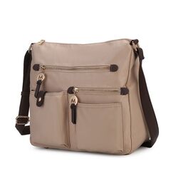 Feature - Design with luxurious gold tone embellishments, the Serena Shoulder Bag is a sophisticated yet street-chic style. Crafted from durable nylon material, with color-block trim in a smooth pebble vegan leather, the Serena Shoulder Bag is a modern take on the wardrobe icon. Unzips it to reveal a one-compartment fully lined interior with a slip pocket and a wall zippered pocket. The Serena Shoulder Bag has many convenient front pockets to keep all your belongings - two zippered pockets with our round medal emblem zipper puller, one slip pocket and a snap closure pocket. It has also a back zippered pocket. The Serena Shoulder has an adjustable strap for comfortable all-day wear. The Serena Shoulder bag has metal feet to keep bag upright position and has a semi structured silhouette. POCKETS - Interior features spacious compartment with two slip pockets and a wall zipper pocket. Exterior features a back deep zipper pocket. In the front, it has also two zipper pockets, and two slip pockets, one of them with a snap closure Measurements - 12 in L x 11.5 in H x 5 in W Adjustable shoulder strap extends to 23.5”