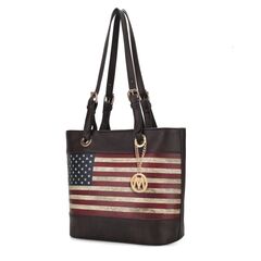The Vera Tote bag is an ideal carryall. Rendered in a printed patriotic flag pattern in a high-quality textured vegan leather, this bag is designed to stow all you need for a busy day. Unzips the center compartment to reveal a printed lined interior with a wall zippered pocket and two slip pockets. The top handles have a buckle, so you choose the best handle drop to carry it. Designed with gold-tone embellishments, it comes with a keychain with our round M emblem on it. The Vera Tote Bag has a soft structured silhouette with flat base for stability and protective metal feet. The Vera Tote Bag is the perfect companion for any outing with the array of organizational features. POCKETS - Interior features a wall zip pocket, two slip pockets. The exterior features one back zip pocket Measurements - 11.8” W x 11” H x 5.9” D Handle Drop - 11.8”