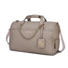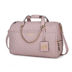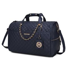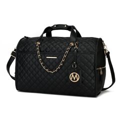 Feature - Stylish and versatile, the Lexie Duffle is your travel must-have, made for the modern woman. Crafted of a high-quality pebbled vegan leather, the Lexie Duffle perfectly combines aesthetics with functionality. Elegantly built, with thoughtful compartments, zippered pockets, and a roomy interior, it can fit anything from an extra pair of clothes to in-flight essentials. The Lexie Duffle can also be your daily work bag or gym bag. Designed with luxurious gold-tone embellishment and a braided chain accent, the Lexie Duffle has two side zippered pockets for easy organization of all your travel necessities and a front pocket with magnetic snap. In the back, it features a trolley sleeve and a zippered pocket. The Lexie Duffle has a structured silhouette with flat base for stability with protective metal feet and removable and adjustable shoulder strap, that makes it easy to carry. The Lexie Duffle has our signature Mia K Collection plate and a hangtag with our large emblem for decoration. POCKETS - Interior features spacious compartment with two slip pockets and a wall zipper pocket. Exterior features a front deep pocket with magnetic snap closure, two side zippered pockets and a back zippered pocket Measurements - 19.25” L x 12” H x 8” W Handle Drop - 1.57” Adjustable shoulder strap - Extends to 23”