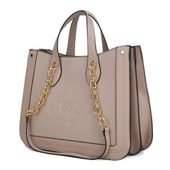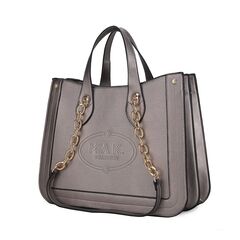 MATERIAL - Made of High-Quality Vegan Leather.FEATURE - Design with Luxurious gold tone embellishments. The Sofia Tote is our new comfortable Tote bag, a seasonless style. The Sofia is a multi-function bag, Front zipper pockets, a lovely smooth two-tone top handle, plus with our new keychain at your use.POCKETS - two exterior Front zipper pocket, one exterior back zipper pocket, two interior pockets, one interior zipper pocket,MEASUREMENTS - 14 in L x 13 in H x 4.5 in DHandle drop - 9”Recommended Weight - 10 LB
