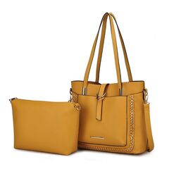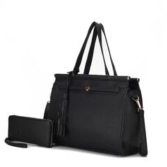 MATERIAL - Made of high-quality vegan leather FEATURE - Designed with luxurious gold tone hardware Zip top closure Contrast piping design Removable signature M keychain Soft pebbled texture Lightweight POCKETS - Interior features an open spacious compartment with a deep wall zippered pocket and hidden slip in pocket to fit larger phones Exterior features hidden front slip in pocket and a generous back slip in pocket can fit a tablet or an iPad MEASUREMENTS - 17 in W x 10.5 in H x 5.5 in D Handle Drop 10 in Wallet MEASUREMENTS - 8 in W x 4 in H x 0.5 in D FEATURE - Designed with luxurious gold tone embellishments POCKETS - Interior features 12 card slots, 2 full bill compartments, a-mid centered zipper pocket Exterior features back zippered pocket Removable wristlet strap 7in