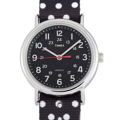 This is the Timex Weekender timepiece, reference number TW2R63000.The watch is presented with a 38 mm silver-tone brass case that features stainless steel back. The case offers water resistance of 30 meters and is mounted onto a reversible nylon slip-through strap (black with white polka dots on one side and solid black on the other), secured on the wrist with a tang buckle. The black INDIGLO® dial with Arabic numerals features central hours, minutes and seconds. The watch is equipped with a quartz movement.This timepiece is offered in an unworn condition and includes the manufacturer’s box and papers.