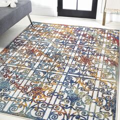 Inspired by scrolling Mediterranean wrought iron, this indoor-outdoor rug will cheer up a kitchen, living room, bedroom or dining room. The multicolored design is an easy maintenance solution for homes with kids and pets. Outdoors, this rug adds a splash of color and Bohemian style to your patio or porch.