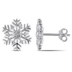 These pretty stud earrings from the Mimi & Max Jewels Collection feature gorgeous snowflakes studded with round white diamonds. This classic pair is set in sterling silver and are secured with butterfly backs. White Diamonds Diamonds - 14 Diamond cut - Round Diamond weight - 0.06ct Color - G-H Clarity - I2-I3 Setting - Prong Metal information and dimensions Metal - Sterling silver Finish - High polish Style - Stud Clasp - Butterfly Metal weight - 1.65 grams Earring dimensions - 11 mm wide x 11.9 mm long x 2 mm deep Diamond total weight - 0.06*ct TW All weights and measurements are approximate and may vary slightly from the listed information. *T.W. (total weight) may vary and is a minimum of 0.051ct. Treatment code N (white diamonds). See Treatment Guide for further information.