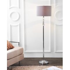 Perfect for rooms with a moody, neutral color scheme in need of a pop of glamour, this floor lamp delivers a lot of style in a classic shape. Accented with a trio of faceted crystal objects at the neck of the base, it is completed with a grey drum shade and chrome body. The crystal finial ties the look together and is seemingly illuminated when the bulb is lit.