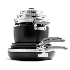 Not just stackable, this collection features unique nesting lids that make sure everything stays together. Each pan also features a diamond-infused ceramic nonstick coating that makes each extremely durable and provides outstanding performance. Only 9.75" tall stacked. The Levels Collection uses 30% less cabinet space than traditional sets. Diamond Advanced Ceramic Nonstick Coating. Multiple diamond-infused layers make our signature healthy ceramic nonstick coating extremely durable, metal utensil safe and give each pan excellent heat transfer. Free of PFAS, PFOA, lead and cadmium, which guarantees that no toxic fumes will release even when accidentally overheated. Set includes - 10" frypan, 12.5" skillet with lid, 1.5 qt. saucepan with lid, 3 qt. saucepan with lid, 6 qt. stockpot with lid, 11 in. grill pan, 3 pan protectors.
