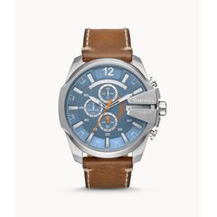 Be a leader, not a follower, in the stainless-steel Diesel Mega Chief watch, an update to the original best seller. The blue sunray chronograph dial features shiny silver indexes for edgy detailing, and an “Only the Brave” tag, while a brown leather strap with debossed construction completes the look.