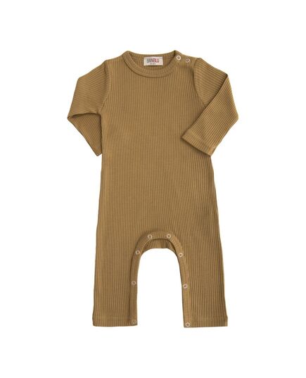 Beige camel long sleeved gender neutral modal romper for babies from BANBLU, featuring a soft and comfortable cotton modal blend, round neck, long sleeves and legs with button closure. 50% Cotton, 50% Modal Machine Wash SKU - 51175-CAMEL