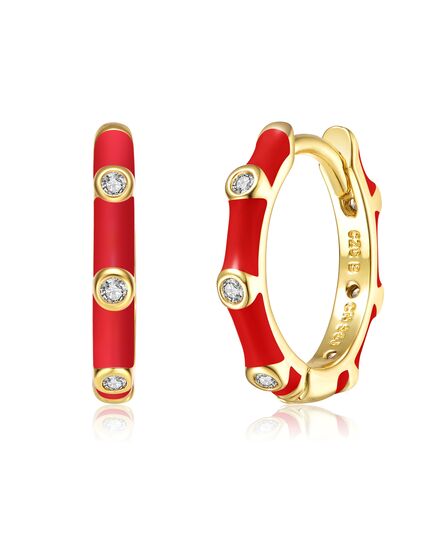 Rg 14k Gold Plated with Diamond Cubic Zirconia Pink Enamel Bamboo Hoop Earrings