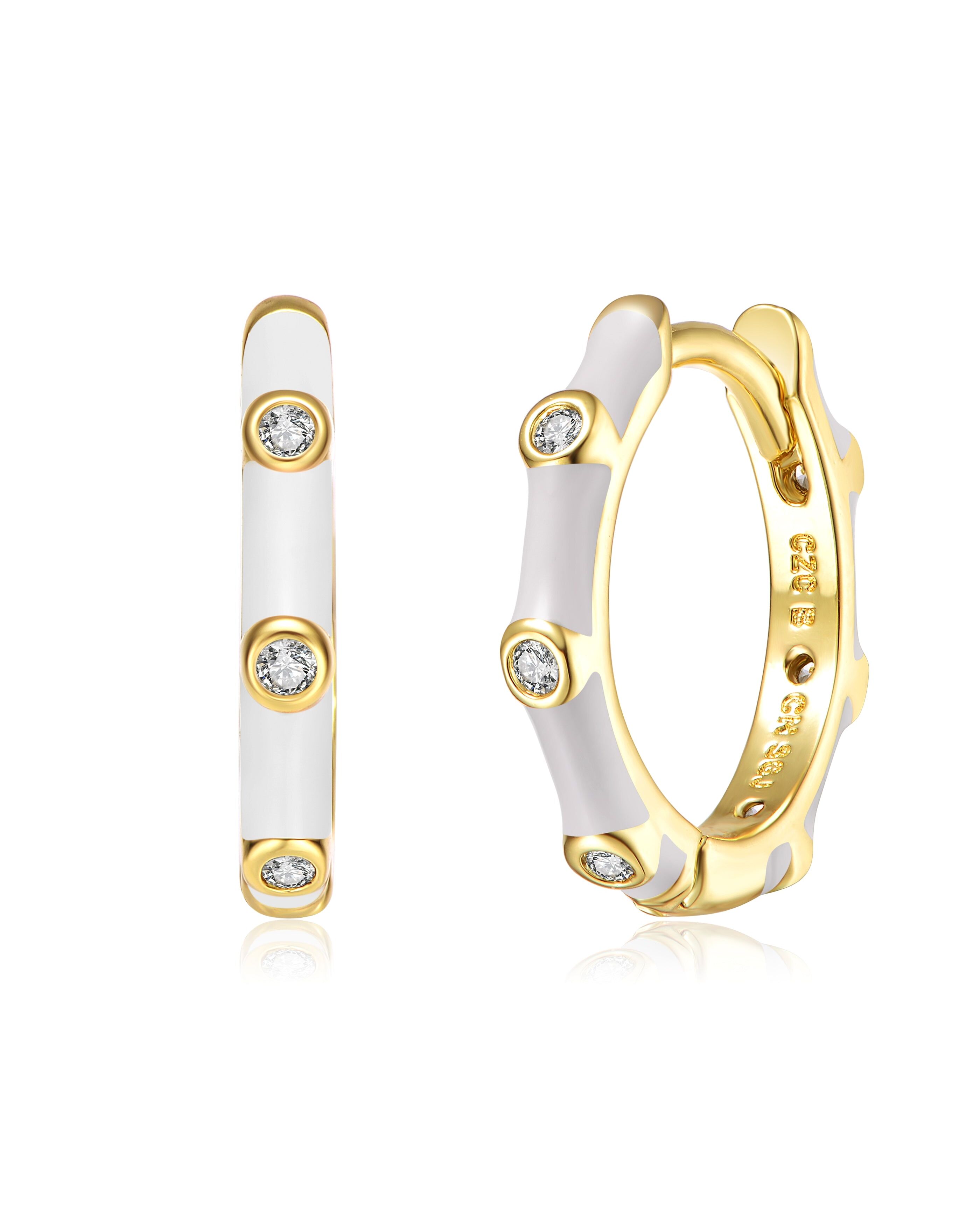 Rg 14k Gold Plated with Diamond Cubic Zirconia Pink Enamel Bamboo Hoop Earrings