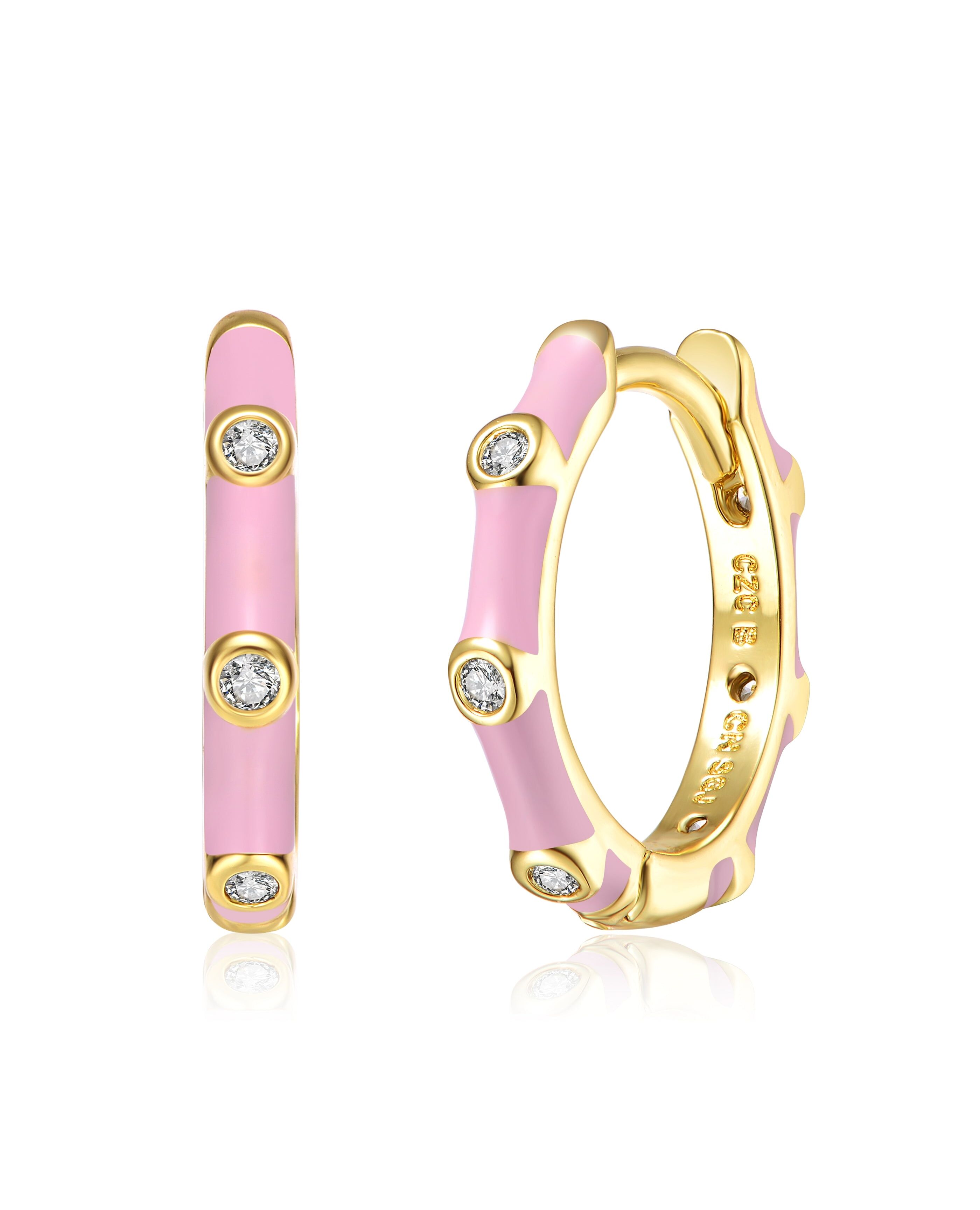 Rg 14k Gold Plated with Diamond Cubic Zirconia Pink Enamel Bamboo Hoop Earrings