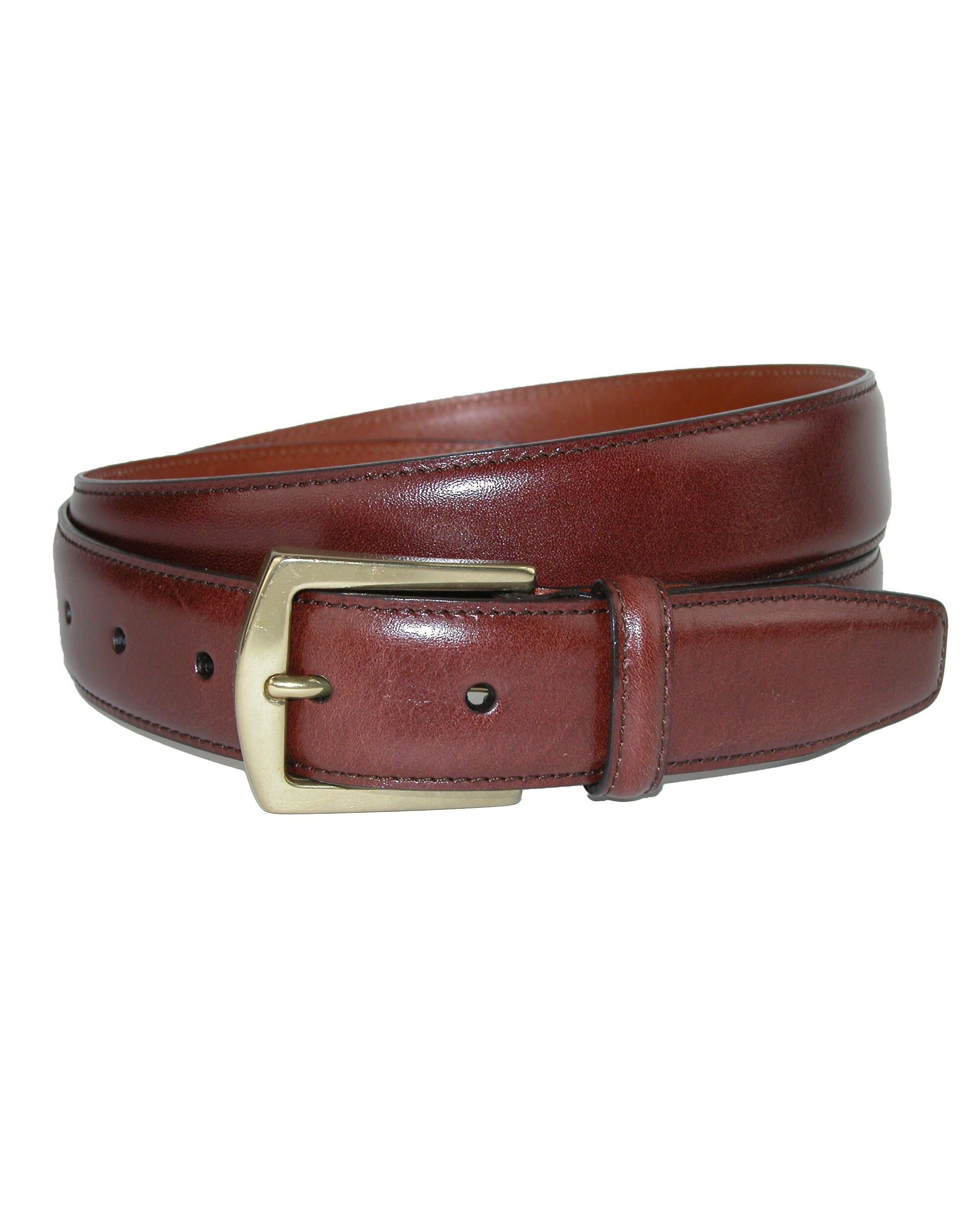 Smooth Italian Calfskin has a feathered edge for a dress look that will look great with everything from a suit to jeans. Lined with Natural Vegetable Dyed Leather, the top is Italian Vegetable Dyed Calfskin. 32mm wide, the feathered edge features a single stitch. English Brass buckle and a single keeper. Handmade in America. Made of Italian Vegetable Dyed Calfskin Measures 1.25 inches or 32mm wide Stitched feather edge Natural Vegetable Dyed Leather Lining Solid Brass Buckle with English Brass finish Made by hand in the USA