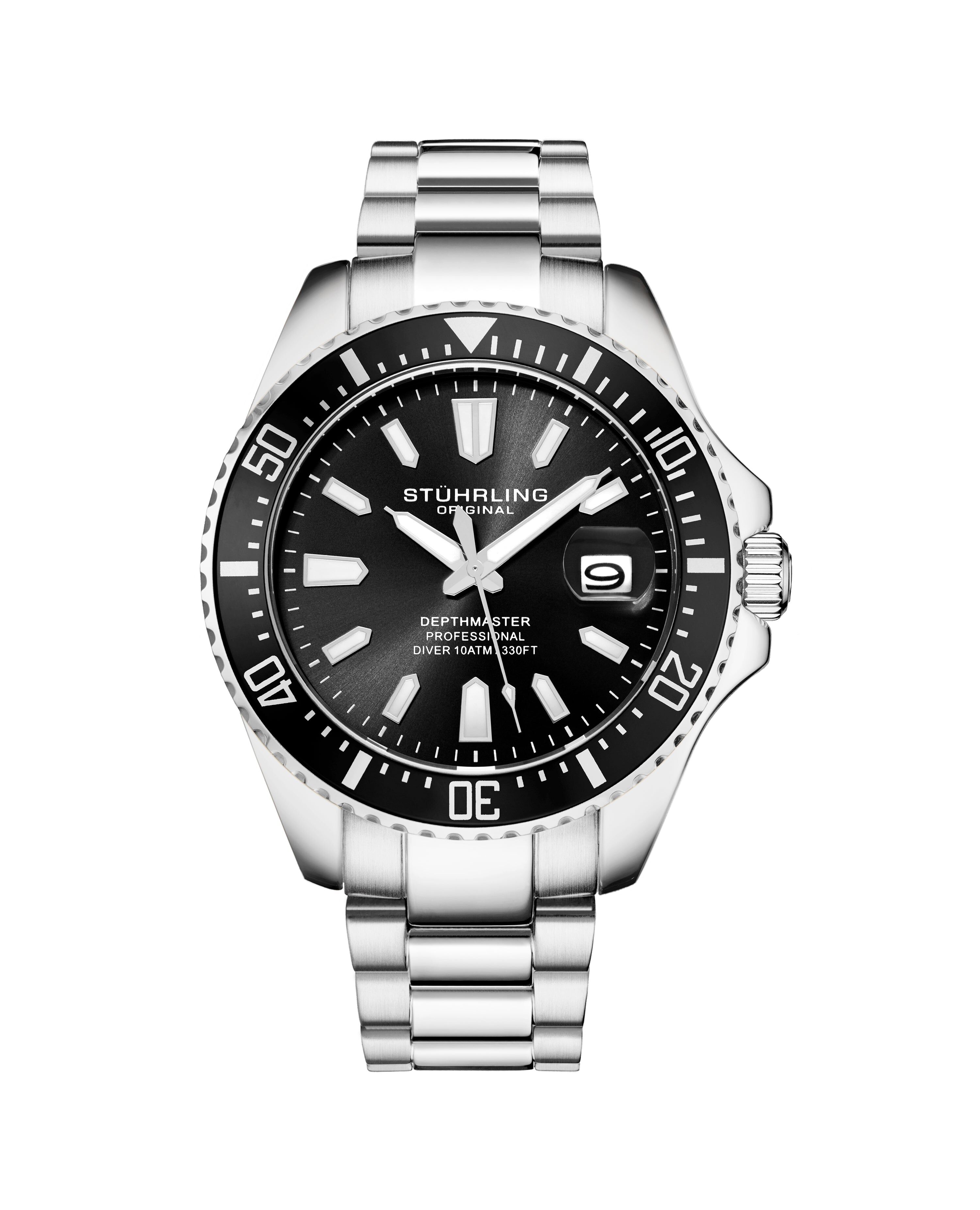 Men's Diver Quartz Watch. This watch has a, Silver Case, Blue Dial, and Blue Bezel, on a Gold/Silver tone Bracelet Watch.