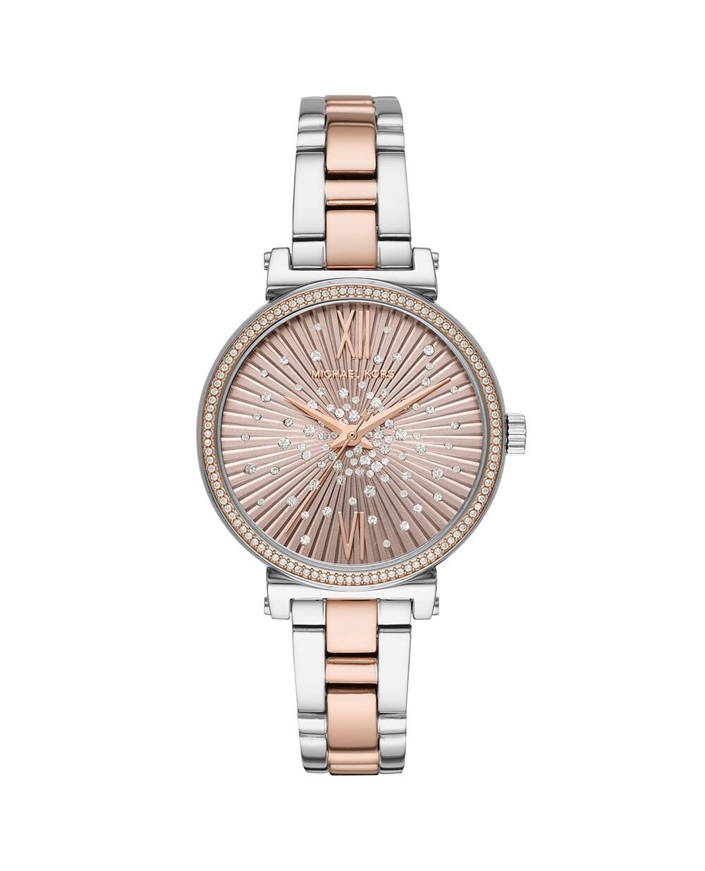 NEW WITH TAGS AND BOXThe Michael Kors Sofie MK3972 blends classic and modern seamlessly. A cool 36mm stainless steel case and bracelet project timeless elegance, while a dazzling crystal-set bezel adds a touch of modern shimmer. The rose gold dial offers a warm touch and clear timekeeping, while reliable quartz movement and 50-meter water resistance ensure everyday functionality. This watch is more than just a timepiece; it's a statement piece that elevates your style.Quartz MovementBand - Stainless SteelPush Button Fold-over ClaspCase Material - Stainless SteelCase Size - 36mmDial Color - Rose GoldWater Resistance - 50mGlass Type - MineralFeatures - Fixed Bezel Set with Crystals, Push/pull Crown