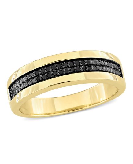 Elevate your style with our 1/10ct TDW Black Diamond Men's Double Row Anniversary Band in Yellow Plated Sterling Silver. This striking ring boasts two rows of exquisite black diamonds, totaling 1/10 carats, set in a lustrous yellow plated sterling silver band. Whether you're commemorating a special occasion or looking to make a bold fashion statement, this ring delivers. The combination of black diamonds and the warm yellow plating creates a captivating contrast that's both modern and timeless, making this ring a remarkable addition to any man's collection. Make a statement with sophistication and flair with this exceptional piece of jewelry.