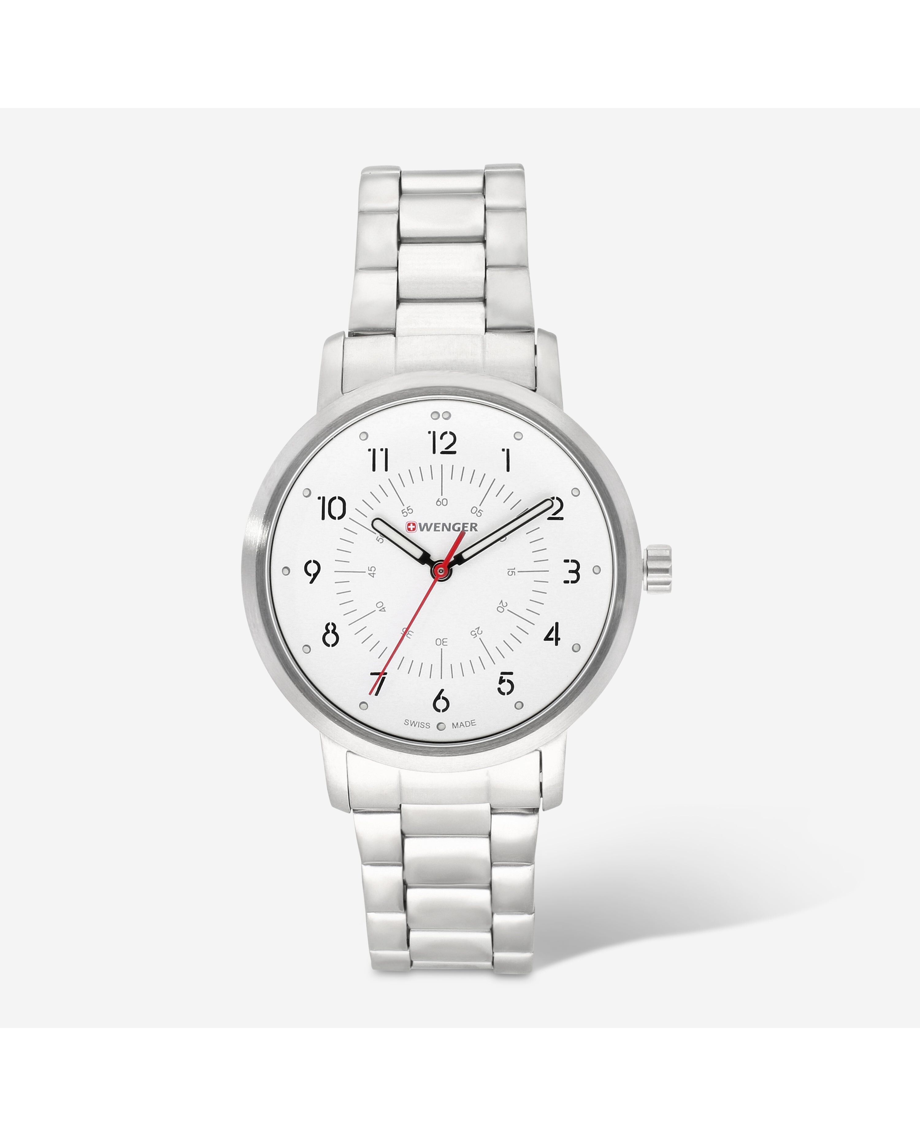 NEW IN THE BOX WITH TAGSMSRP $195Brand - WengerModel - 01.1621.110Movement - Swiss QuartzCase Material - Stainless SteelCase Diameter - 35 mmDial Color - WhiteBand Material - Stainless SteelBand Width - 17 mmWater Resistance - 10 ATM/100 M/330 FTFunctions - Luminous Hands and MarkersCrystal - Sapphire Coated MineralFeatures - Durable stainless steel constructionReliable Swiss quartz movementWater resistance suitable for swimming and snorkelingLuminous hands and markers for easy reading in low lightScratch-resistant sapphire-coated mineral crystal for added durabilityOriginal Wenger packagingThis watch combines functionality with sleek design, perfect for both everyday wear and outdoor adventures.