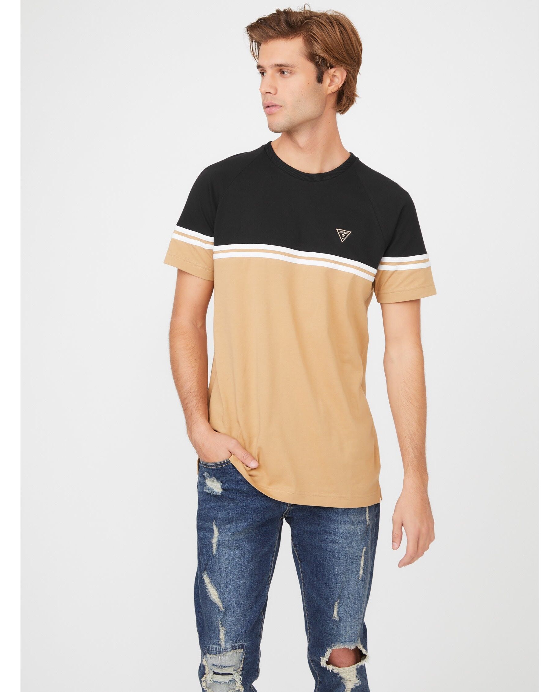A casual essential, this short-sleeve tee features a color-block design, striped details, an embroidered triangle logo and crew neckline. Organic cotton fiber.