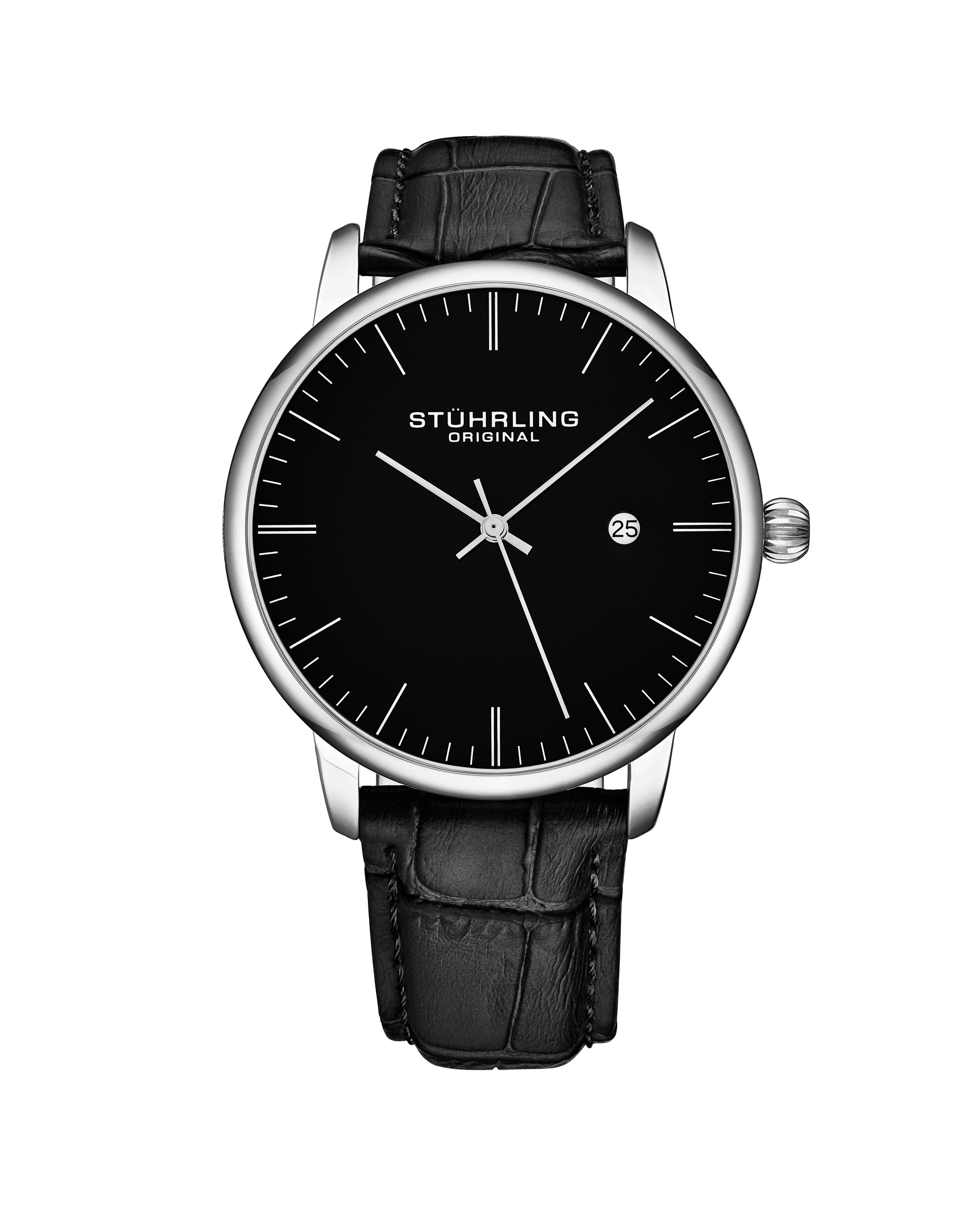 Men's Quartz Date Watch. This watch has a Silver Tone Alloy Case, and White Dial, on a Blue Leather Strap.