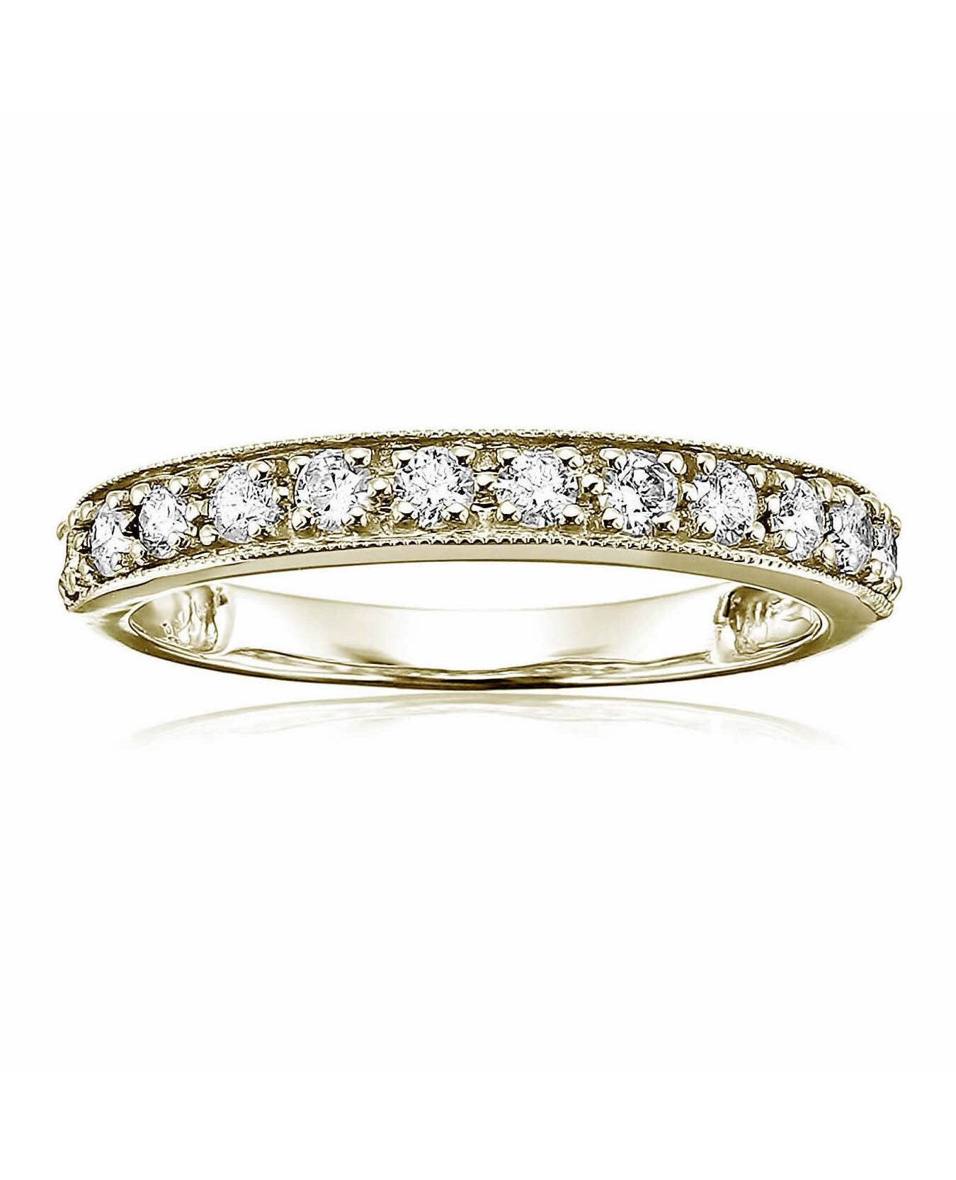 Ships within 1 dayLovely, elegant 1/2 cttw milgrain diamond wedding band in 14k white or yellow gold. The 11 sparkling diamonds are natural diamonds set in a prong setting. The ring weighs 1.7 grams. This ring is available in multiple sizes. Gift box is included with this bridal ring.This style can be made in additional ring sizes and metal. Please contact us.Stone Type - Natural DiamondMetal - 14K White or Yellow GoldDiamond Carat Weight - 1/2 cttw (0.50 cttw)Diamond Cut - RoundDiamond Color - I-JDiamond Clarity - I1-I2Diamonds - 11Vir Jewels 14K White or Yellow Gold Wedding Band For Female AdultBirthstone Month - April