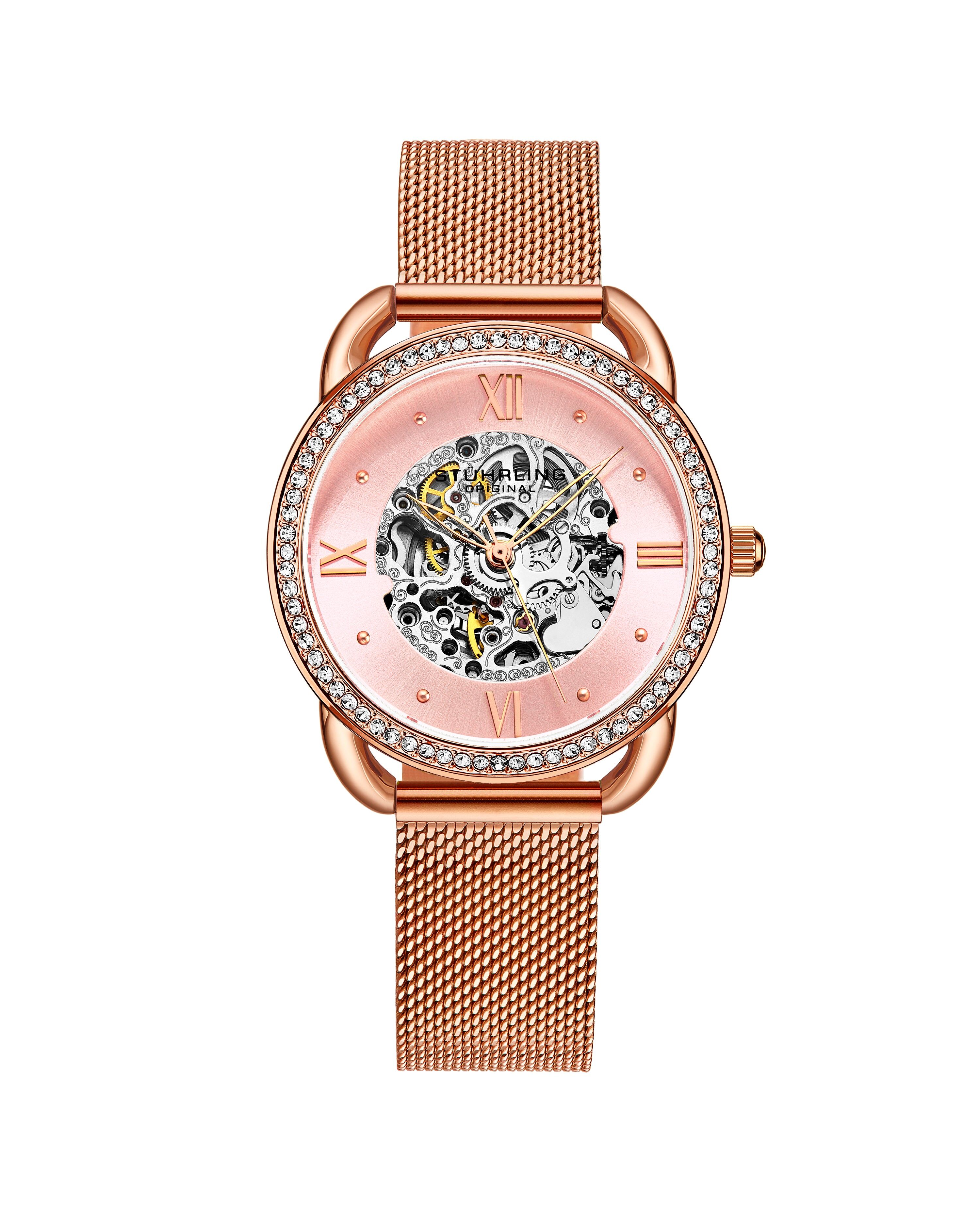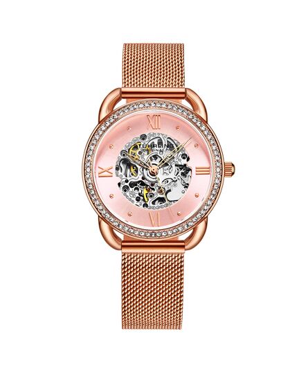 Ladies Automatic Skeleton Watch. This watch has a Silver Case, Silver Crystal Studded Bezel, Silver Dial, Rose and Gold Hands and Markers, on a Silver Mesh Bracelet Strap Watch.
