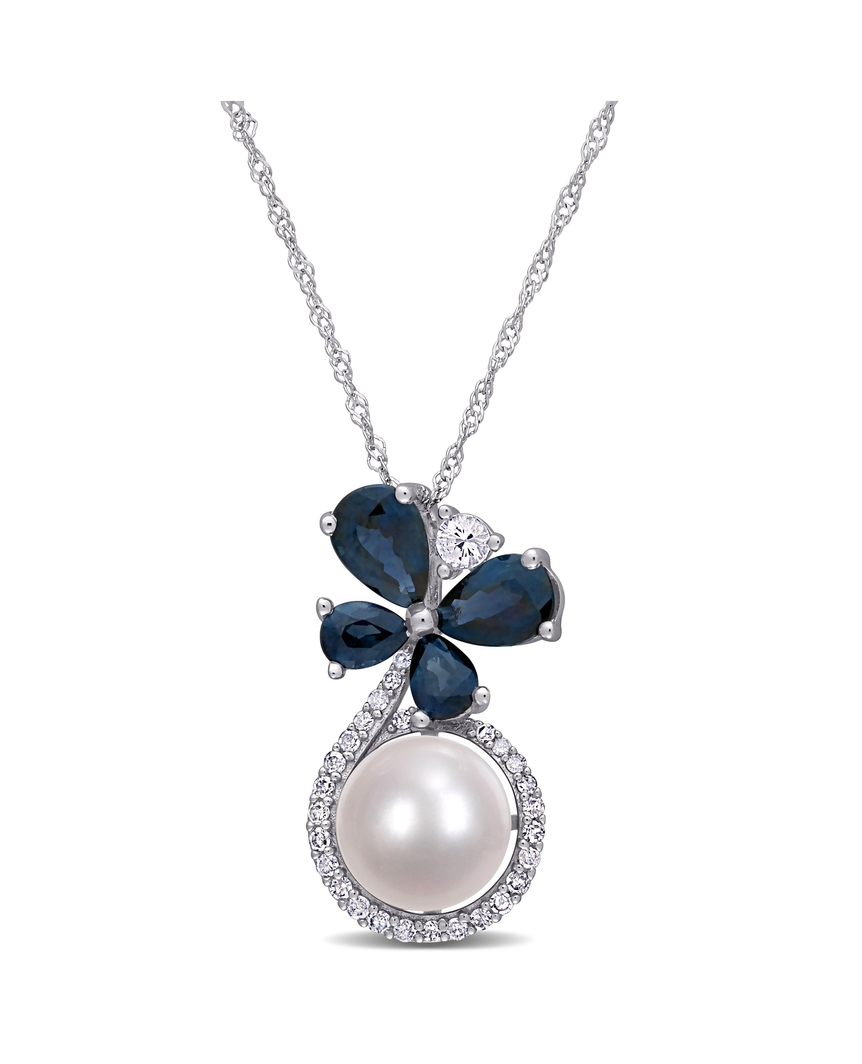 7.5-8 MM Cultured Freshwater Pearl and Sapphire White Sapphire and 1/8 CT TW Diamond Butterfly Drop Necklace in 10k White Gold
