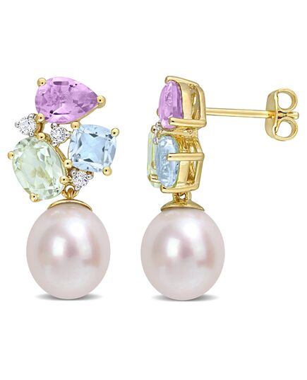 9-9.5 MM Freshwater Cultured Pearl and 4 3/4 CT TGW Multi-Color Gemstone Drop Earrings in Yellow Plated Sterling Silver