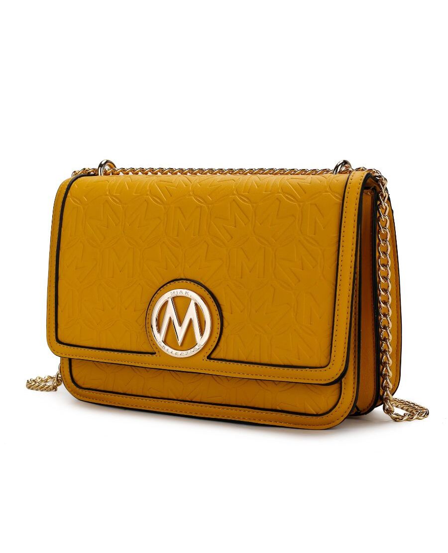 One bag, many occasions - our Amiyah shoulder bag defines everyday sophistication. Designed in a fold-over silhouette with gold-tone hardware and with our M emblem embossed on it, this bag will hold all your daily essentials. Crafted from smooth vegan leather, with a magnetic snap closure, open it to reveal a fully lined two-compartments interior with a slip pocket and a wall zippered pocket. Its polished chain-trimmed strap is versatile enough to be worn crossbody on over your shoulder. Reach for it to top off any look with polish. POCKETS - Interior features a wall zip pocket, one slip pocket. Measurements - 10” W x 7” H x 3.5” D Adjustable Shoulder strap - Extends to 24”