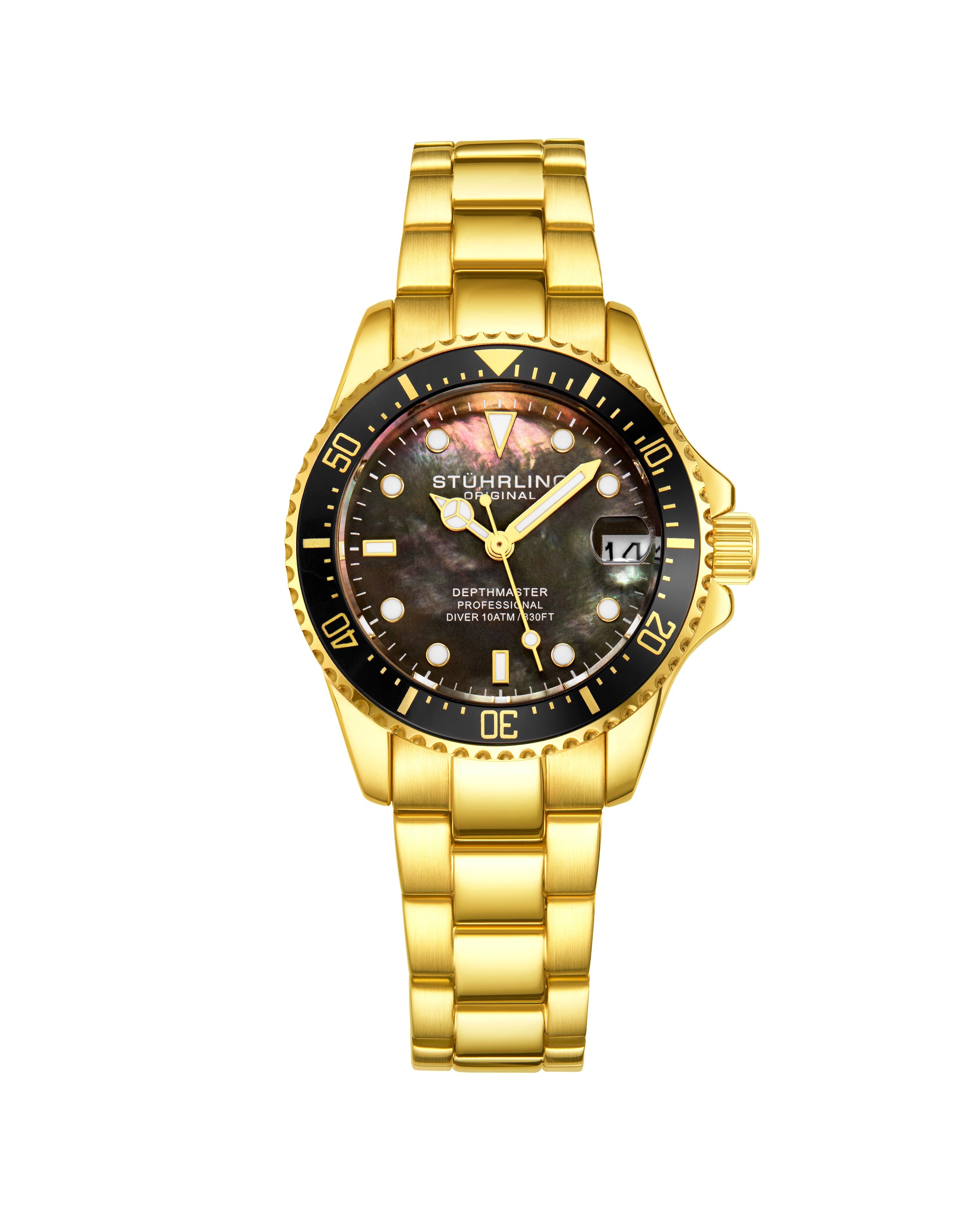 Women's Quartz Diver Watch. This watch has a Gold case, and Black MOP Dial, on a Gold-tone Bracelet Watch.
