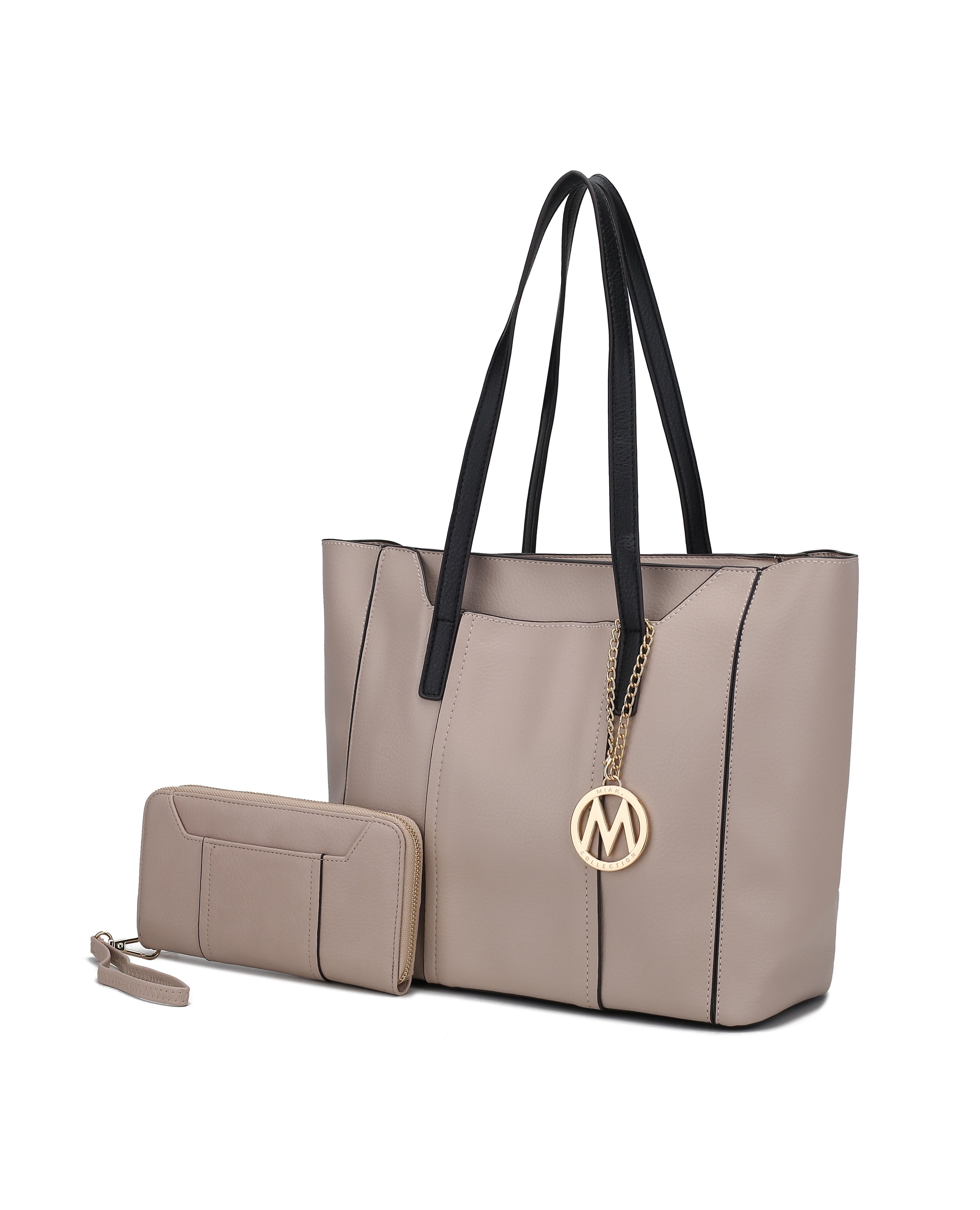 MATERIAL - Made of high-quality vegan leatherFEATURE - Designed with luxurious gold tone hardwareZip top closureContrast piping designRemovable signature M keychainSoft pebbled textureLightweightPOCKETS - Interior features an open spacious compartment with a deep wall zippered pocket and hidden slip in pocket to fit larger phonesExterior features hidden front slip in pocket and a generous back slip in pocket can fit a tablet or an iPadMEASUREMENTS - 17 in W x 10.5 in H x 5.5 in DHandle Drop 10 inWallet MEASUREMENTS - 8 in W x 4 in H x 0.5 in DFEATURE - Designed with luxurious gold tone embellishmentsPOCKETS - Interior features 12 card slots, 2 full bill compartments, a-mid centered zipper pocketExterior features back zippered pocketRemovable wristlet strap 7in