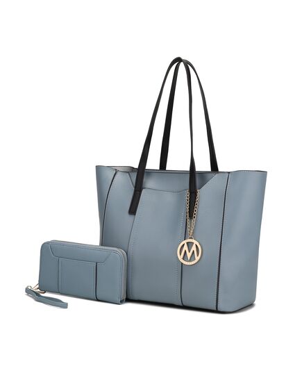 MATERIAL - Made of high-quality vegan leatherFEATURE - Designed with luxurious gold tone hardwareZip top closureContrast piping designRemovable signature M keychainSoft pebbled textureLightweightPOCKETS - Interior features an open spacious compartment with a deep wall zippered pocket and hidden slip in pocket to fit larger phonesExterior features hidden front slip in pocket and a generous back slip in pocket can fit a tablet or an iPadMEASUREMENTS - 17 in W x 10.5 in H x 5.5 in DHandle Drop 10 inWallet MEASUREMENTS - 8 in W x 4 in H x 0.5 in DFEATURE - Designed with luxurious gold tone embellishmentsPOCKETS - Interior features 12 card slots, 2 full bill compartments, a-mid centered zipper pocketExterior features back zippered pocketRemovable wristlet strap 7in