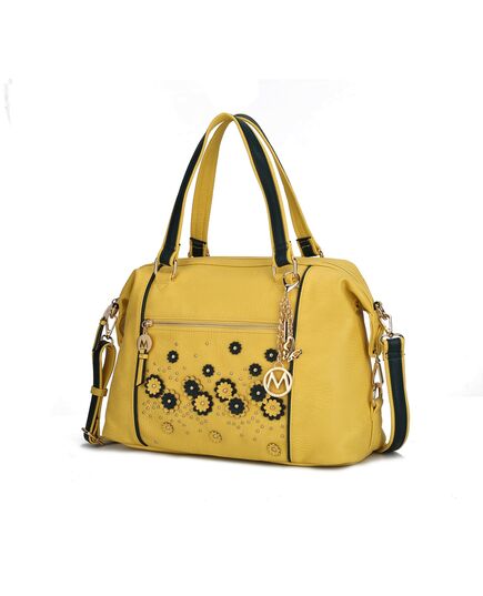 Looking for flowers that never fade? With a 3-D color block floral design with studs make this Francis Tote Bag a lovely way to carry your belongings. Made of a high quality grainy vegan leather, this Bag features detachable and adjustable shoulder strap for everyday versatility. Designed with gold-tone embellishments, the Francis Tote Bag unzips to reveal a fully lined interior with slip pockets and a wall zippered pocket. It has a convenient exterior zipper pocket and is accented with a signature charm. It has a soft silhouette and a flat base for stability. POCKETS - Interior features a wall zip pocket, two slip pockets. Exterior features one zippered back pocket and one front zip pocket. Measurements - 14.5” W x 11.2” H x 4.7” D Handle Drop - 6.7” Adjustable and Removable strap - 12”-25” Pouch - 10” W x 7”H Wallet with wristlet - 7.5” w x 4” H x 1” D 1 center zip pocket, 8 card slots, 2 slip pocket, zip fastening