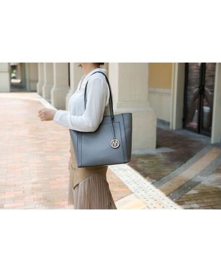 MATERIAL - Made of High-Quality Vegan Leather. FEATURE - Design with Luxurious gold tone embellishments. The Leah tote is our classic tote handbag, seasonless style. Smooth handle and Hand-Painted Edges. Front pocket and snap closure. POCKETS - One exterior front slit pocket, One interior zipper pocket. MEASUREMENTS - 12 in W x 12 in H x 5 in D Handle Drop - 11” Recommended Weight - 10 LB