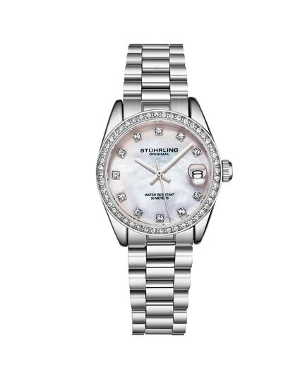 Women's Quartz Fashion Watch. This watch has a Silver Case, Gold Toned Crystal Studded Bezel, Silver MOP Dial, Gold Toned Hands, and Crystal Markers With Gold Toned Rings, on a TT Silver And Gold Toned Bracelet Watch.