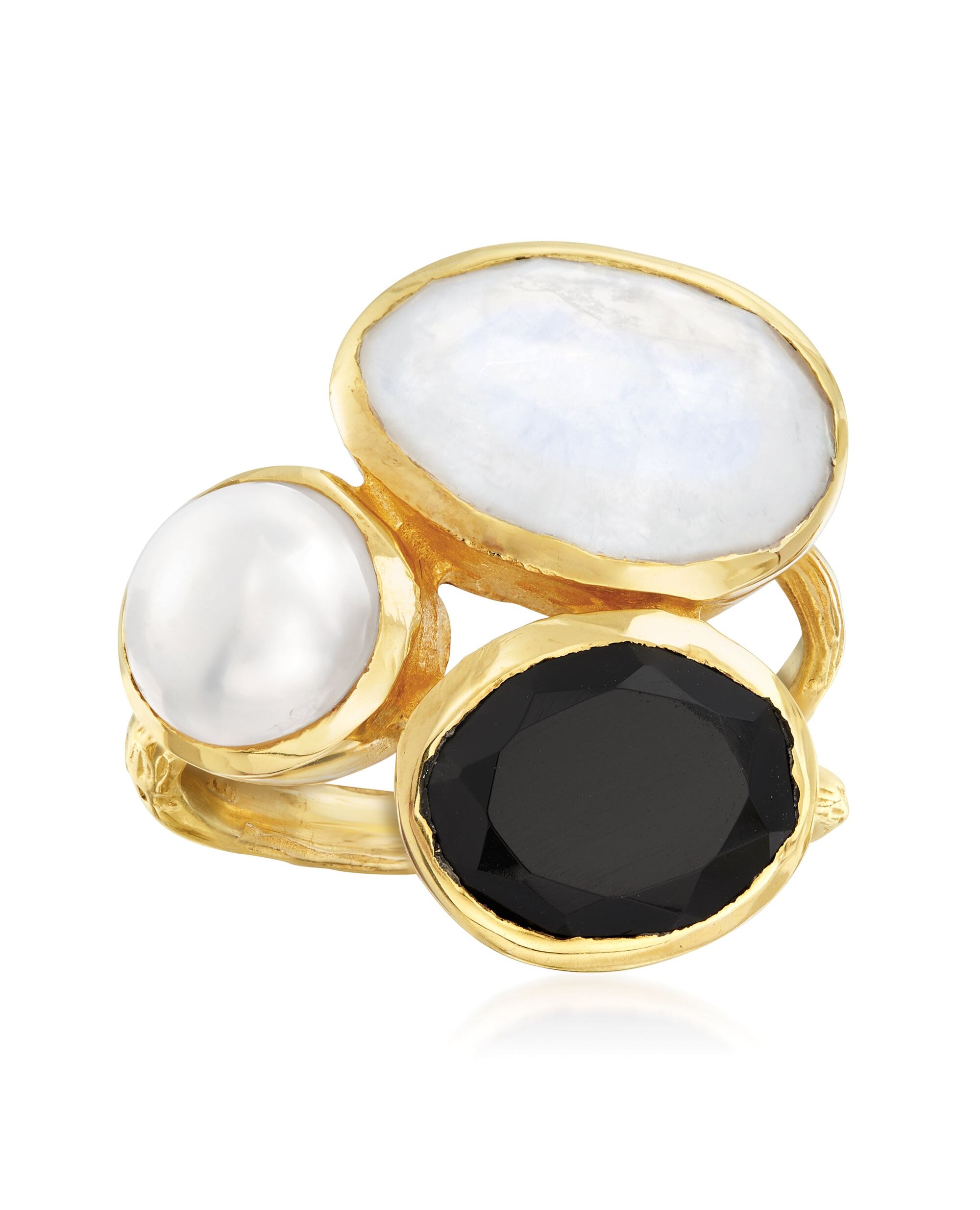 Ross-Simons 8mm Cultured Pearl, Black Onyx and Moonstone Ring in 18kt Gold Over Sterling