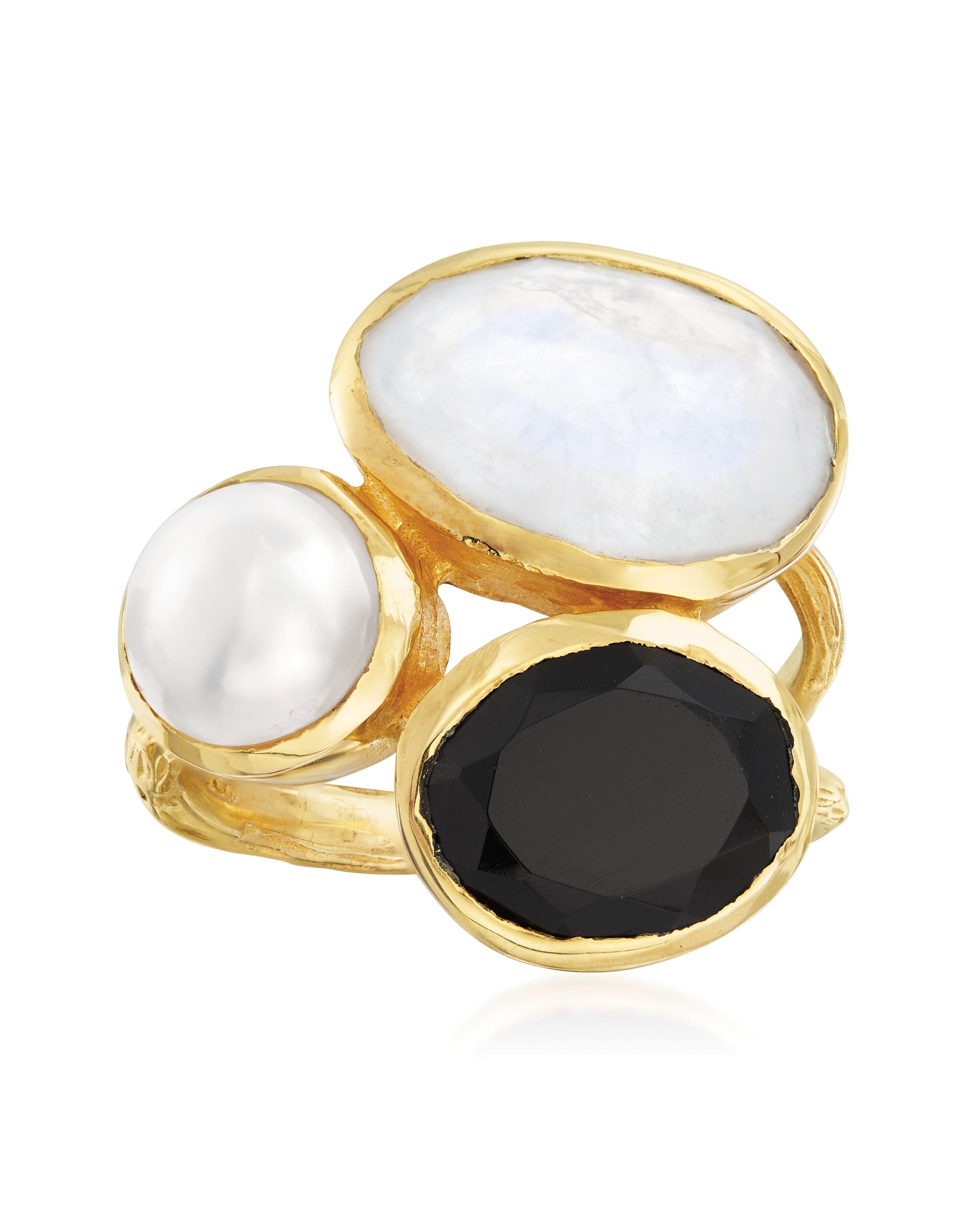 Ross-Simons 8mm Cultured Pearl, Black Onyx and Moonstone Ring in 18kt Gold Over Sterling