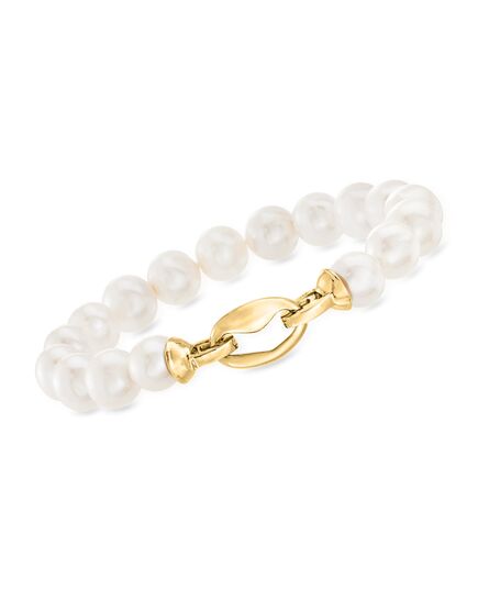 A top-rated jeweler since 1952, Ross-Simons travels the world to find high-quality styles at the best prices. Classic pearls get a modern touch that makes this bracelet perfect for day-to-day stylings. On it, 9-10mm cultured freshwater pearls culminate to a polished 18kt yellow gold over sterling silver foldover clasp. Single-latch safety. White pearl bracelet. Each Ross-Simons item arrives in a fine jewelry presentation box. Shop Ross-Simons jewelry risk-free as all items include a 30-day, 100% money-back guarantee.Pearl InformationPearl Type 1 - Freshwater-CulturedPearl Minimum Color 1 - Freshwater-CulturedPearl Lustre 1 - Medium-LusterPearl Shape 1 - Semi-RoundPearl Uniformity 1 - GoodPearl Surface Blemishes 1 - Moderately BlemishedPearl Stringing Method 1 - Moderately BlemishedSize Per Pearl 1 - 9-10mmNumber Of Pearls 1 - 17