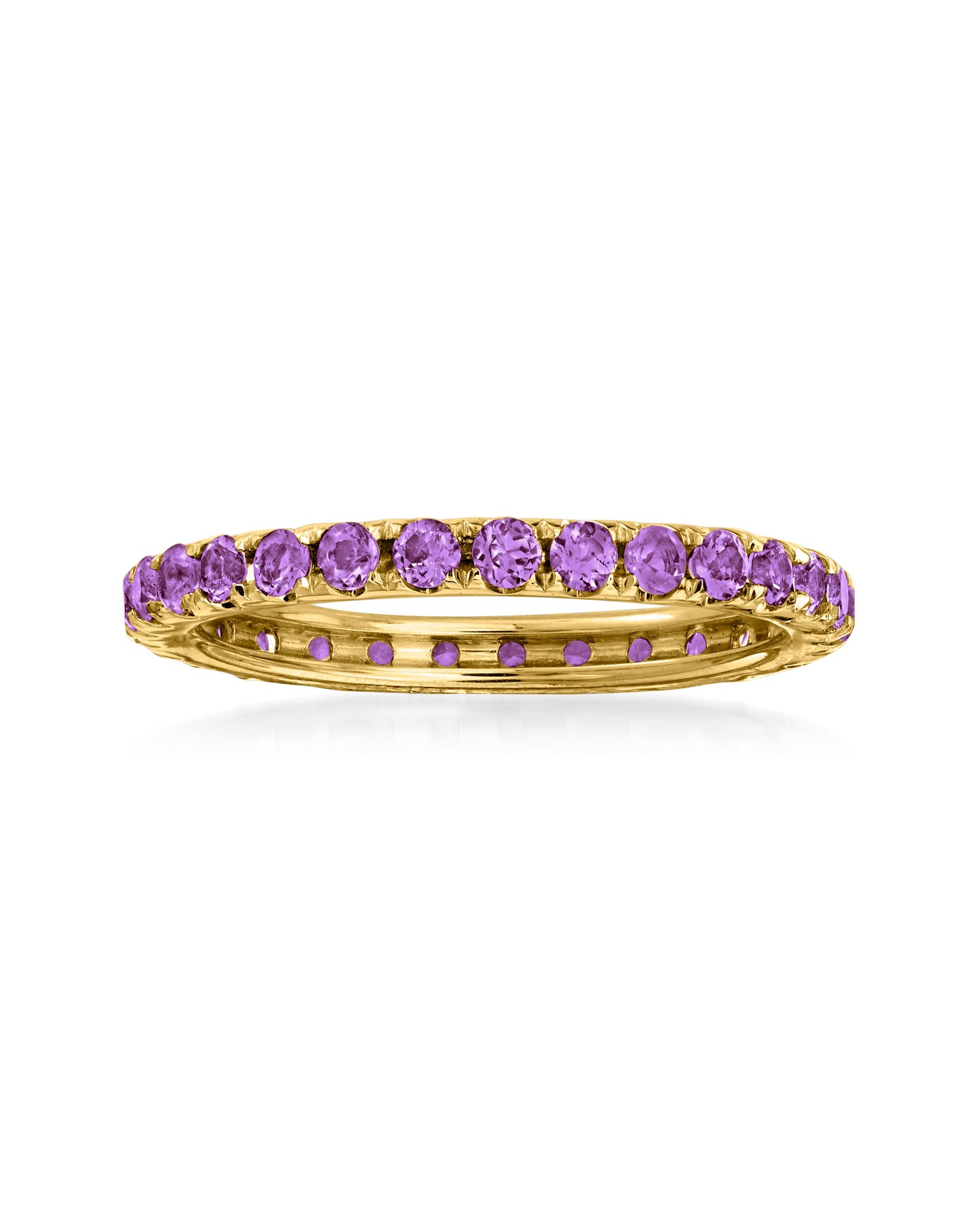 Established in 1952, Ross-Simons brings jewelry classics into the modern era. Take a classic gemstone like amethyst and make it modern. The perfect ode to your February birthstone, this 0.80 ct. t.w. amethyst eternity band is just the right pop of color for everyday. Set in polished 14kt yellow gold. Amethyst eternity band. Each Ross-Simons item arrives in a fine jewelry presentation box. Shop Ross-Simons jewelry risk-free as all items include a 30-day, 100% money-back guarantee.Stone InformationGem Type 1 - AmethystStone Cut 1 - Good-CutStone Color 1 - Violet-BlueStone Clarity 1 - Violet-BlueStone Shape 1 - Round-ShapeStone Creation Method 1 - NaturalStone Treatment Method 1 - Heat-TreatedStone Weight 1 - 0.80-0.90 CaratsNumber Of Stones 1 - 27-32