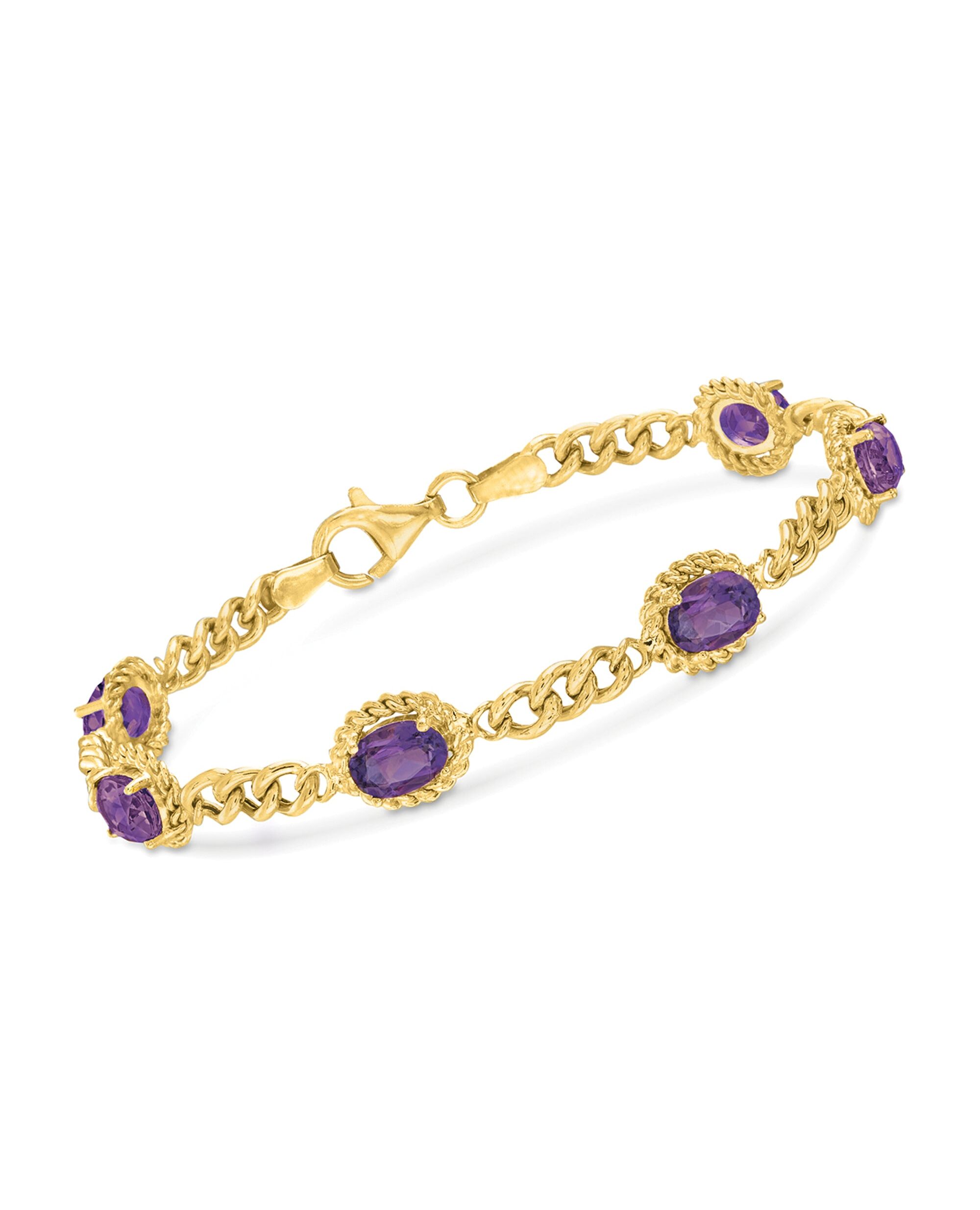 Ross-Simons is the authority on luxury classics. This link bracelet is sumptuous with 4.40 ct. t.w. amethysts brought together by petite links of 18kt yellow gold over sterling silver. Textured oval settings give prominence to each and every charming purple gemstone. Finished to a high shine. Lobster clasp, purple amethyst bracelet. Each Ross-Simons item arrives in a fine jewelry presentation box. Shop Ross-Simons jewelry risk-free as all items include a 30-day, 100% money-back guarantee.Stone InformationGem Type 1 - AmethystStone Cut 1 - Good-CutStone Color 1 - Violet-BlueStone Clarity 1 - Violet-BlueStone Shape 1 - Oval-ShapeStone Creation Method 1 - NaturalStone Treatment Method 1 - Heat-TreatedStone Weight 1 - 4.40 CaratsNumber Of Stones 1 - 6